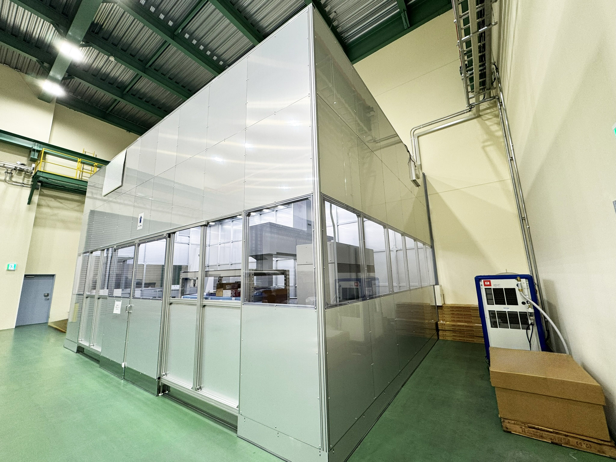 当初のご要望は温調ブースでしたが、お客様の方でブース内に空調機器を設置されるとの事でしたので、側面に見えるFFUは換気目的で取り付けております。