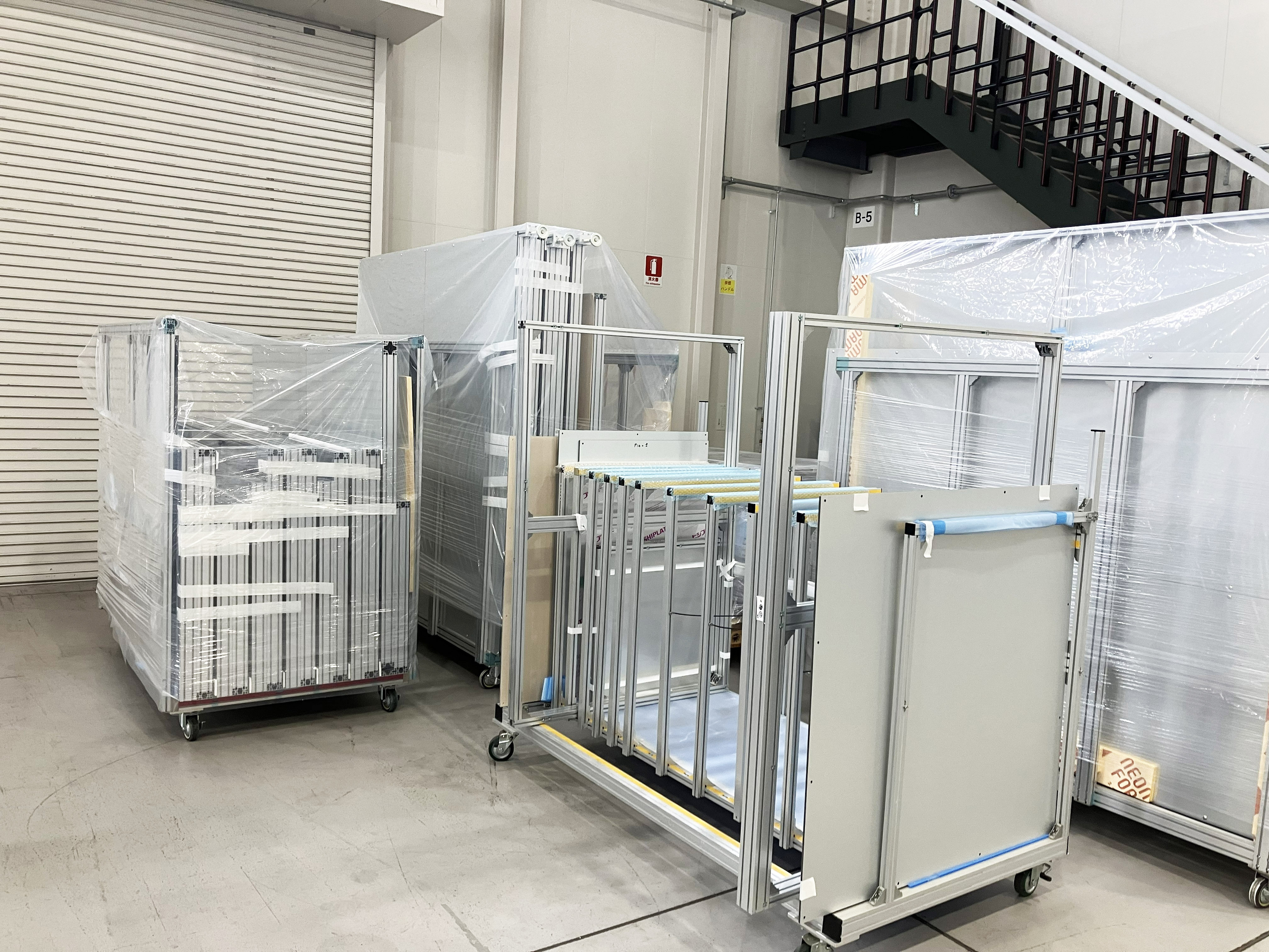 中に入る装置の大きさに合わせ、工場の作業スペースを有効活用するために前後で幅が違いますが、