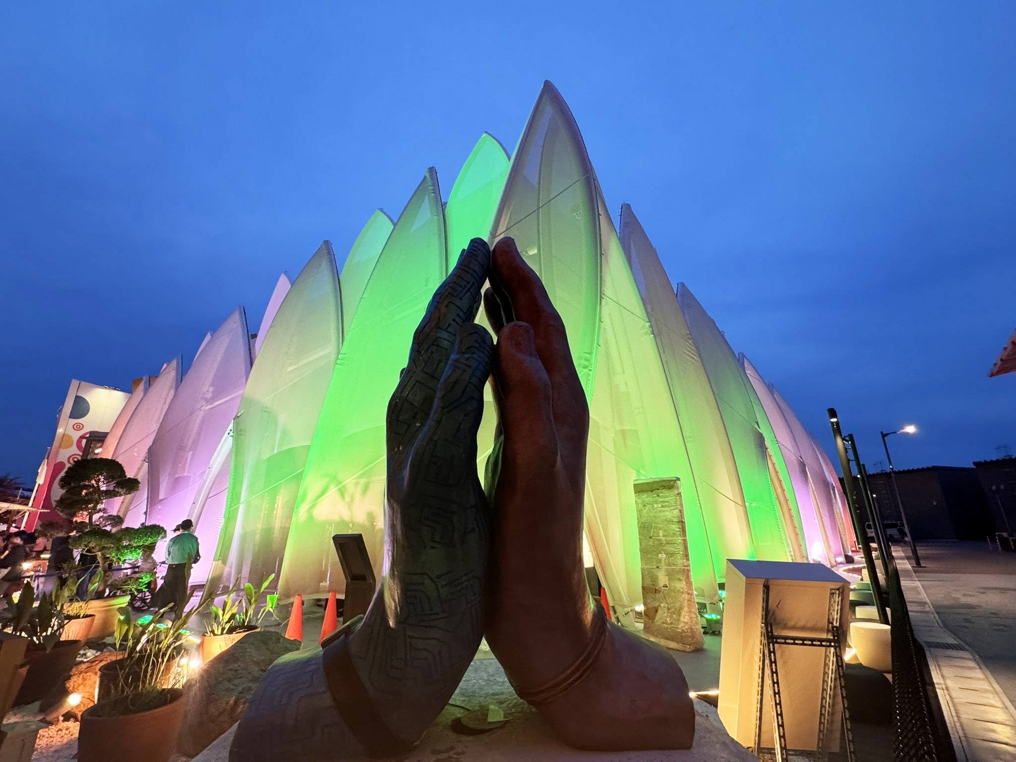 工事が遅れて会期中に間に合うのか?と一時話題になったインド館、無事完成されたんですね、よかった〜。まさに手を合わせたくなるオブジェですね。ナマステ〜(-人-)