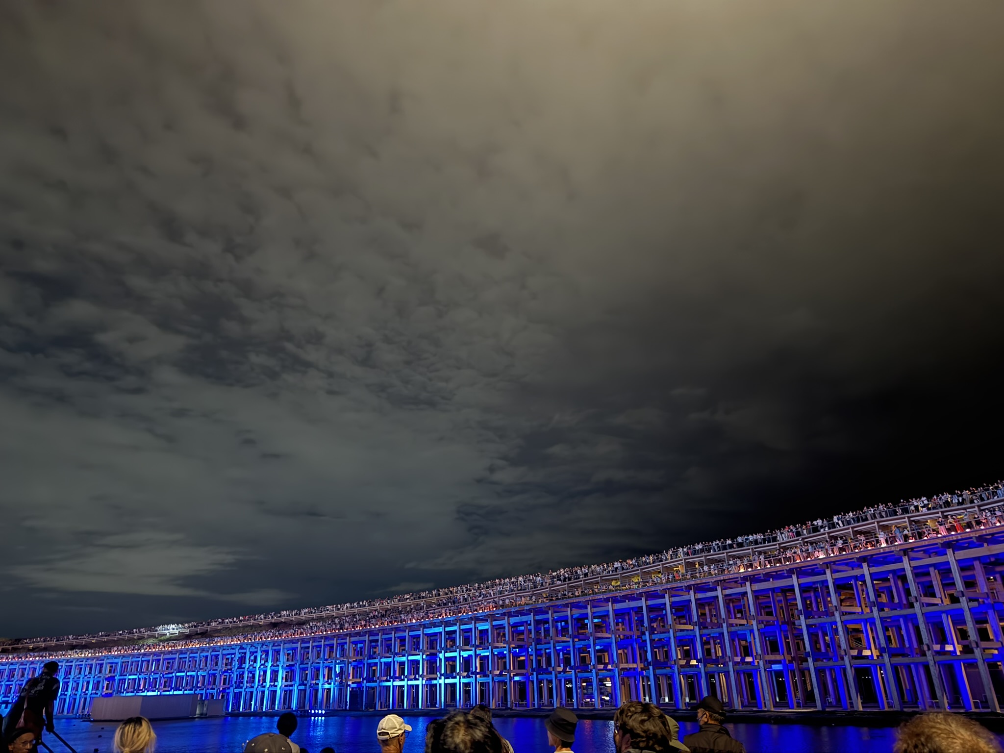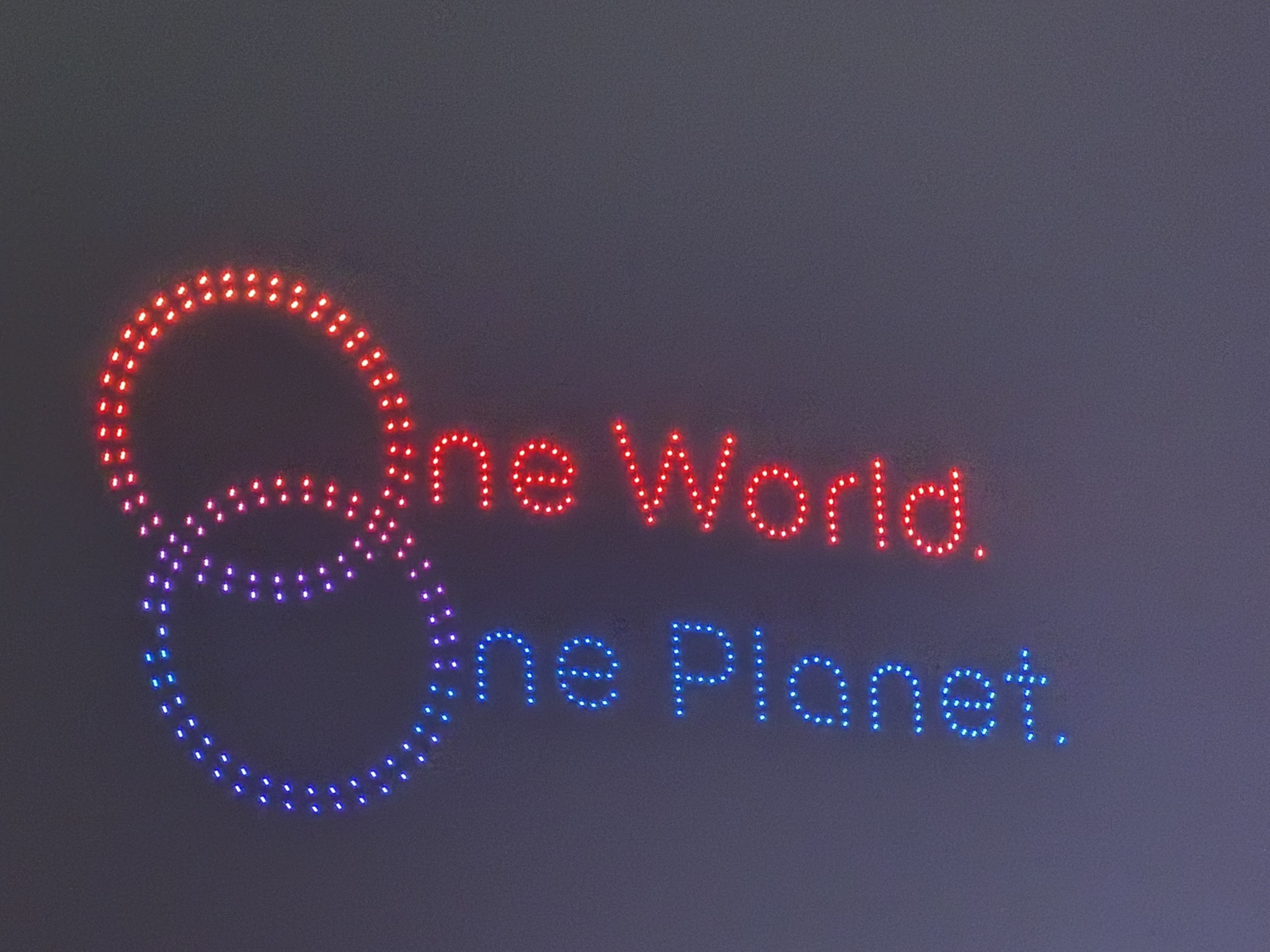 大屋根リングがライティングされ、その上で色んな形や文字に変化するドローンショーがとても綺麗でした。