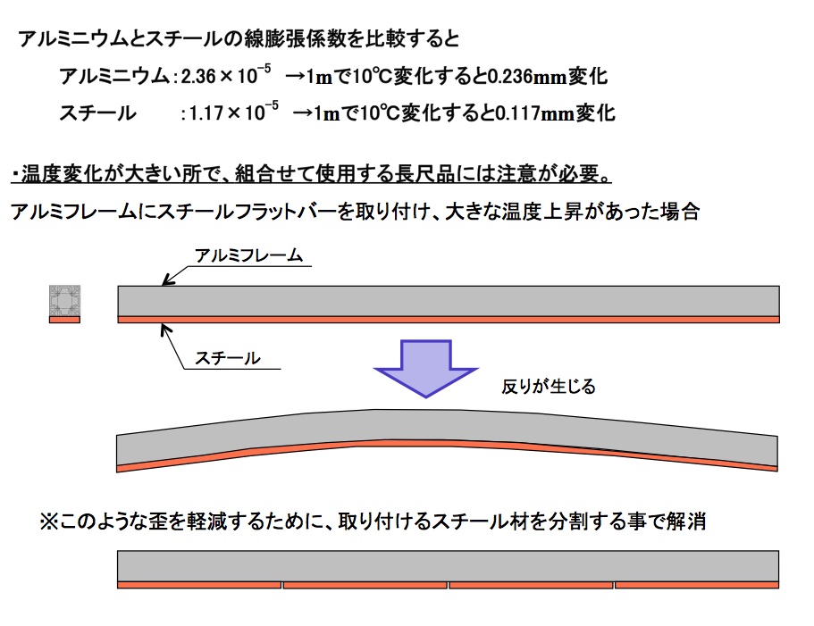 猛暑が終わり秋を迎えておりますが、アルミフレームの温度変化による変形(膨張)について教えて下さい。 アルミフレームは線膨張係数が大きいので温度変化により伸び縮みすると聞いております。住居のアルミサッシはほとんど変化していないと思われるの...