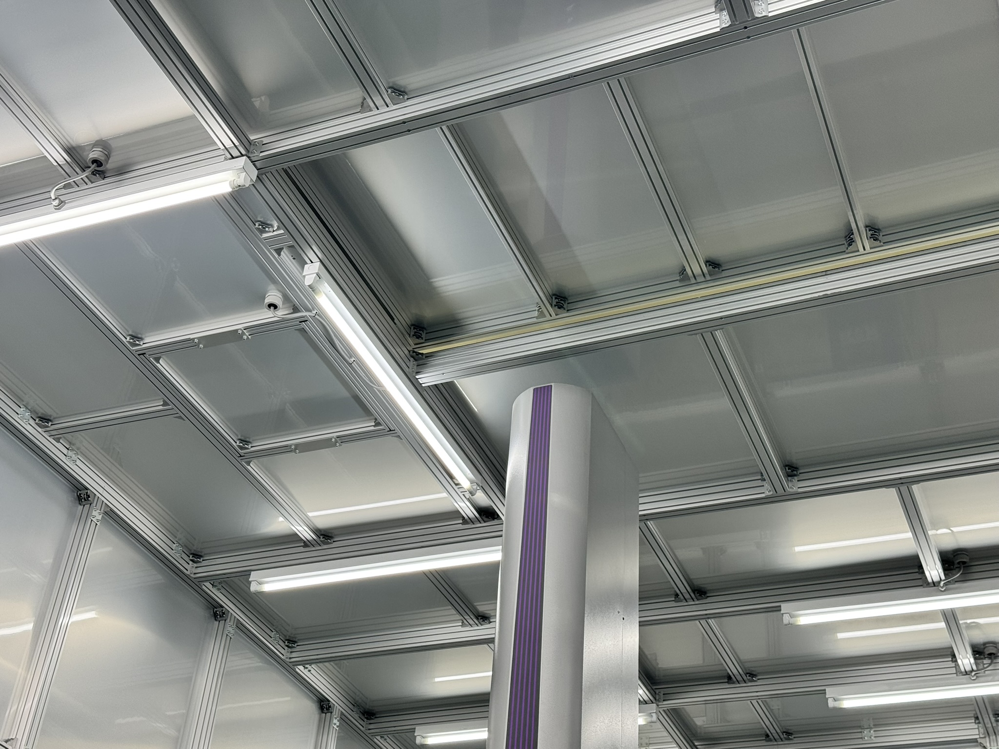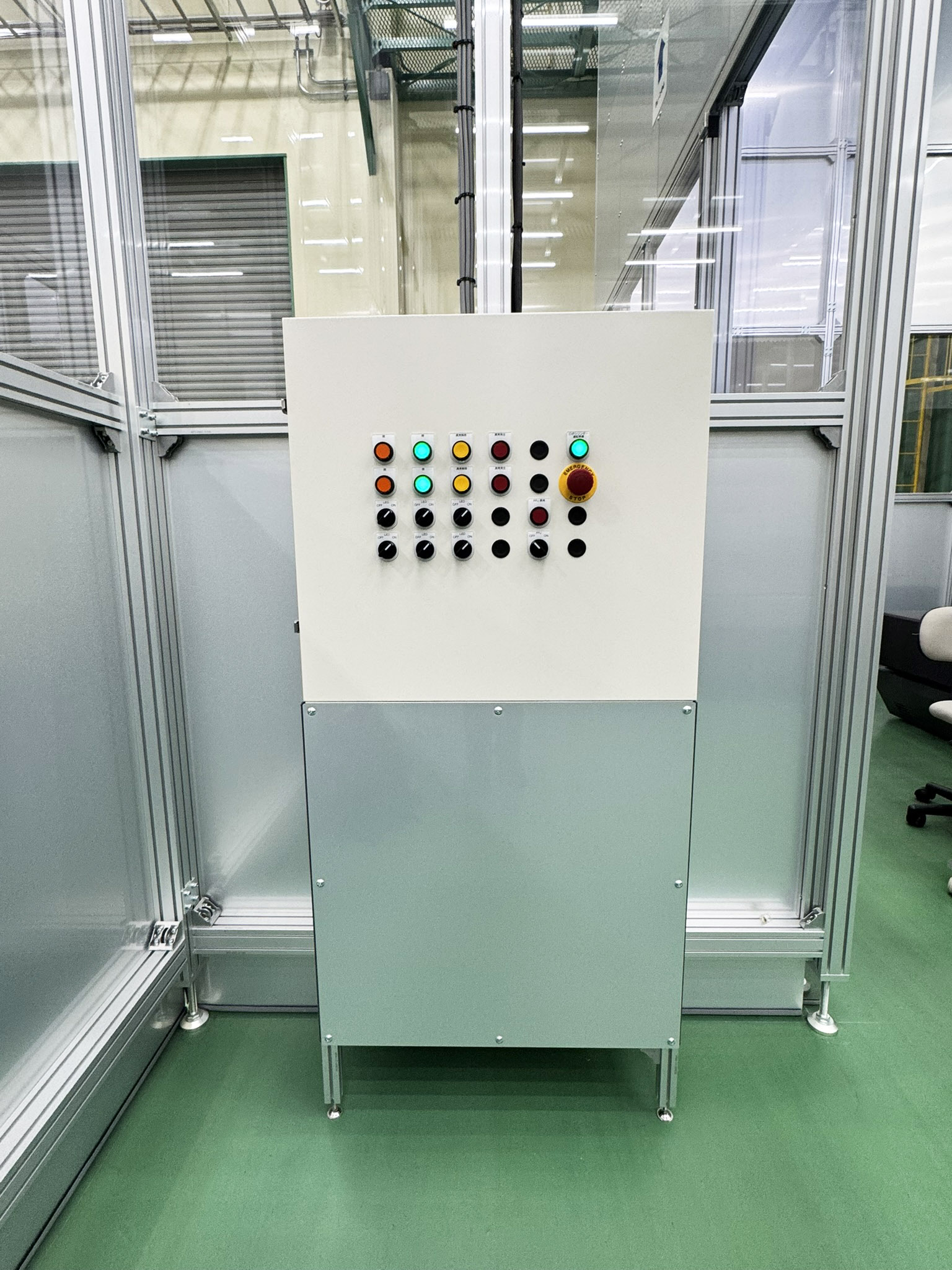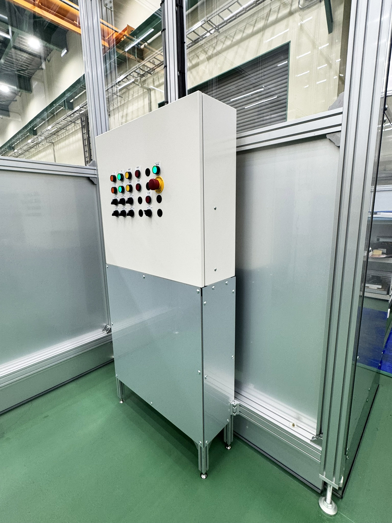 当初のご要望は温調ブースでしたが、お客様の方でブース内に空調機器を設置されるとの事でしたので、側面に見えるFFUは換気目的で取り付けております。